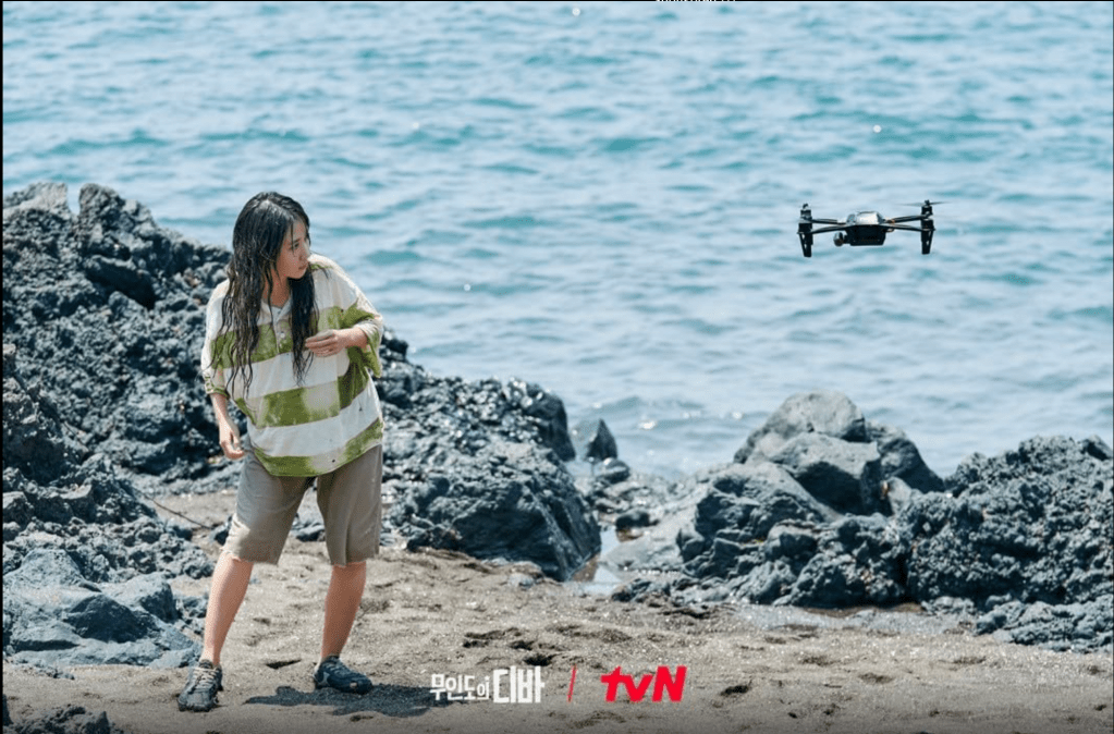 Ki-ho recovers in the hospital and searches as much as he can for Mok-ha, but eventually gives up. Mok-ha washes up on an abandoned island, and her father’s body washes up there as well. He did not survive. And there Mok-ha lives until a drone spots her.
